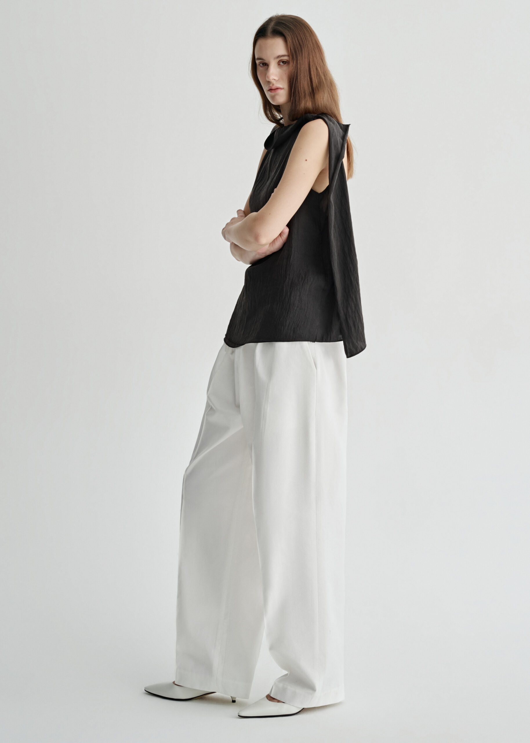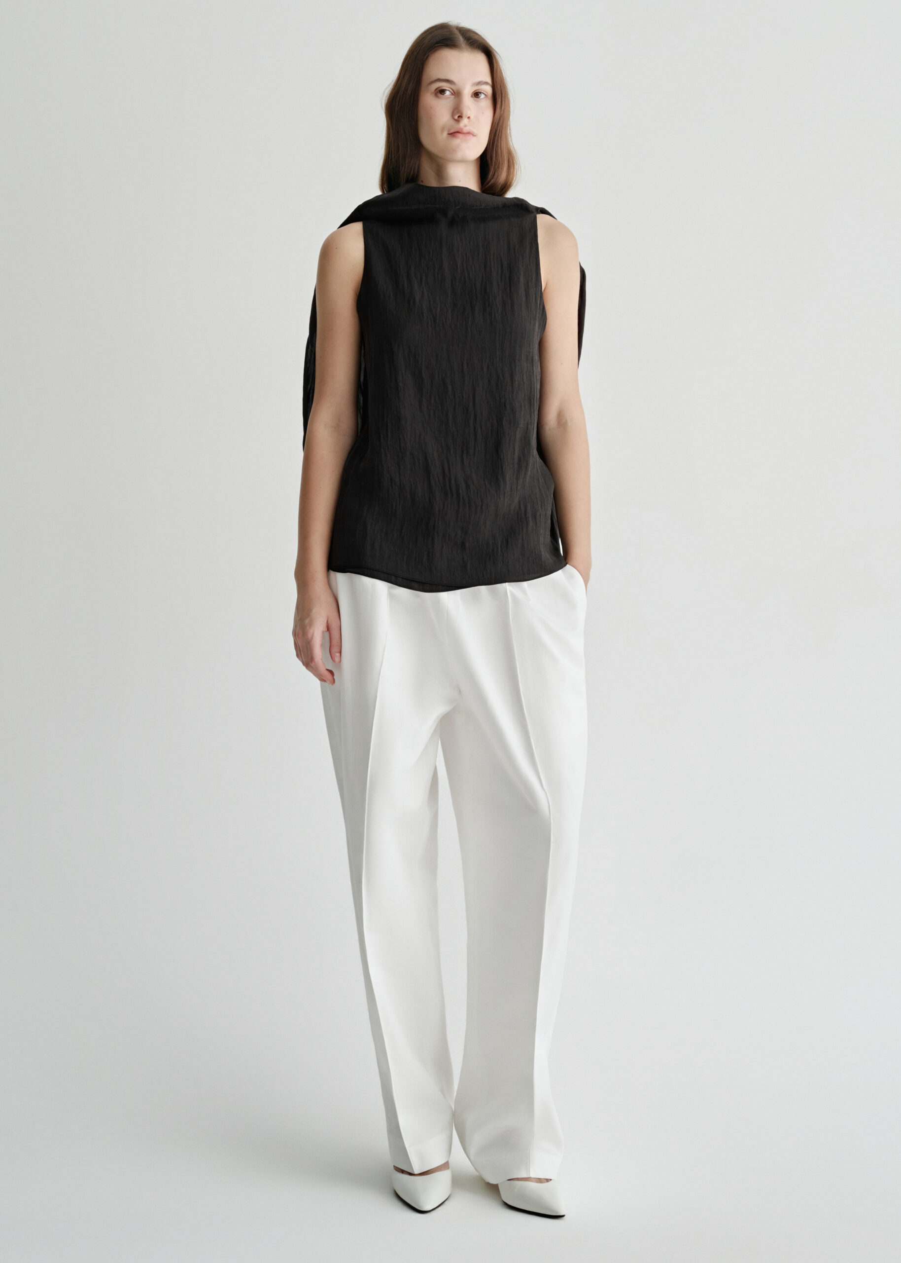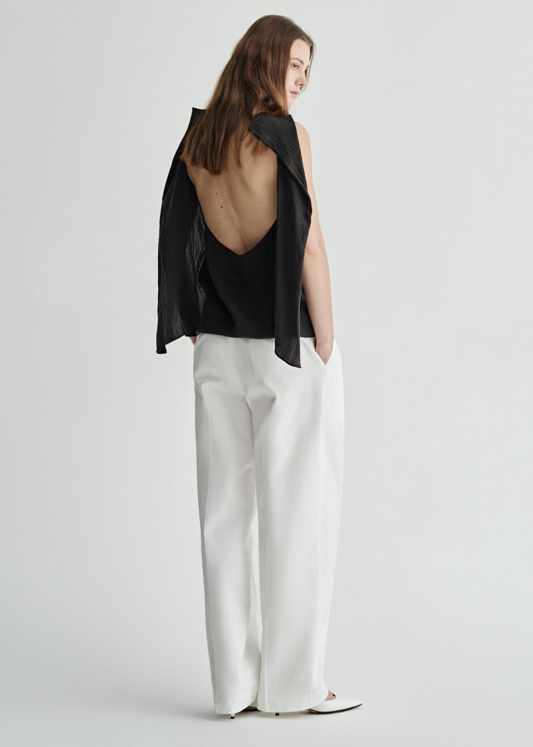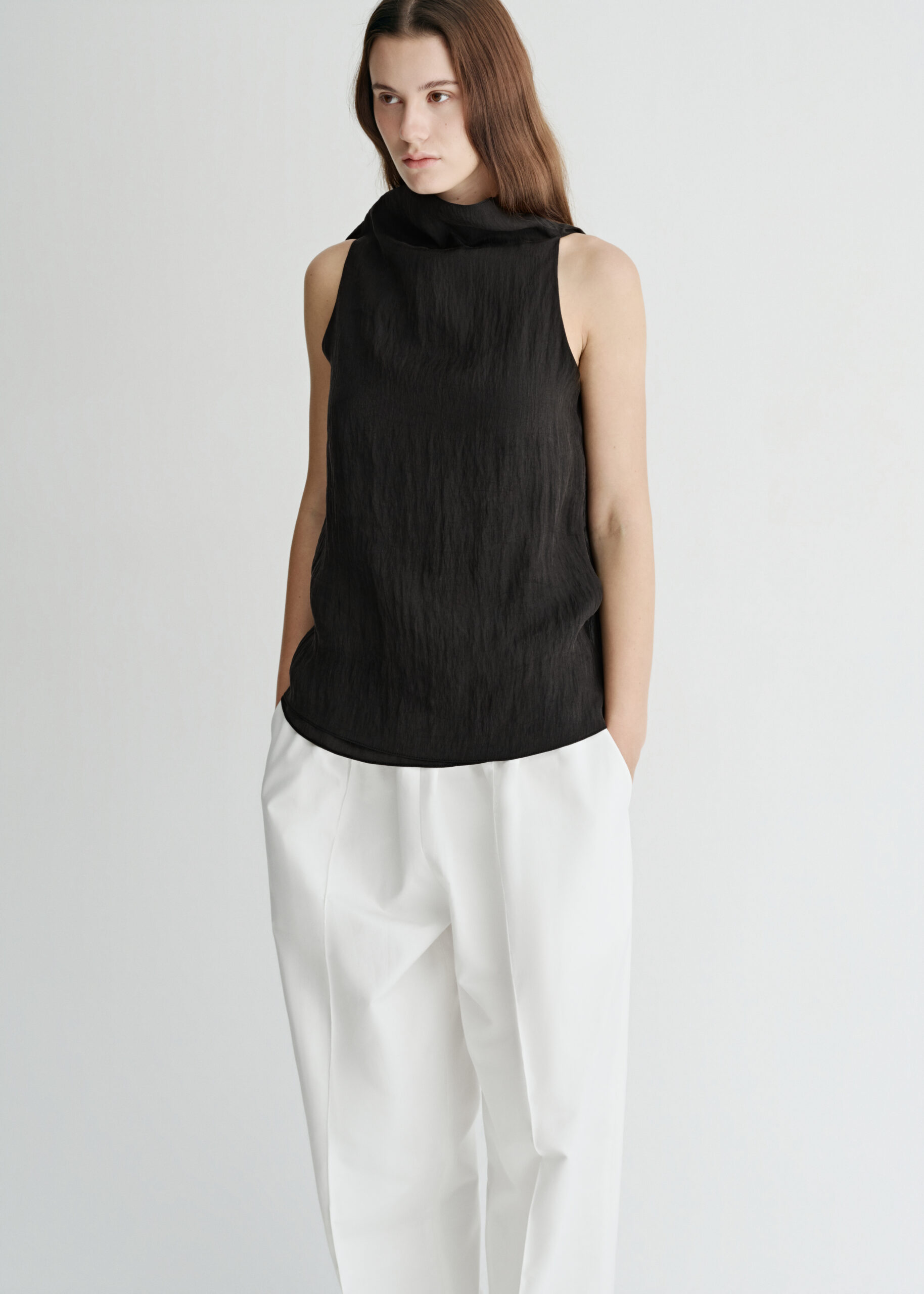 A clean high neckline with a minimal structure is paired with a softly draped back detail, creating a relaxed silhouette with gentle movement.