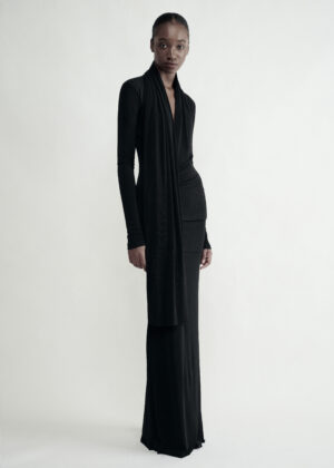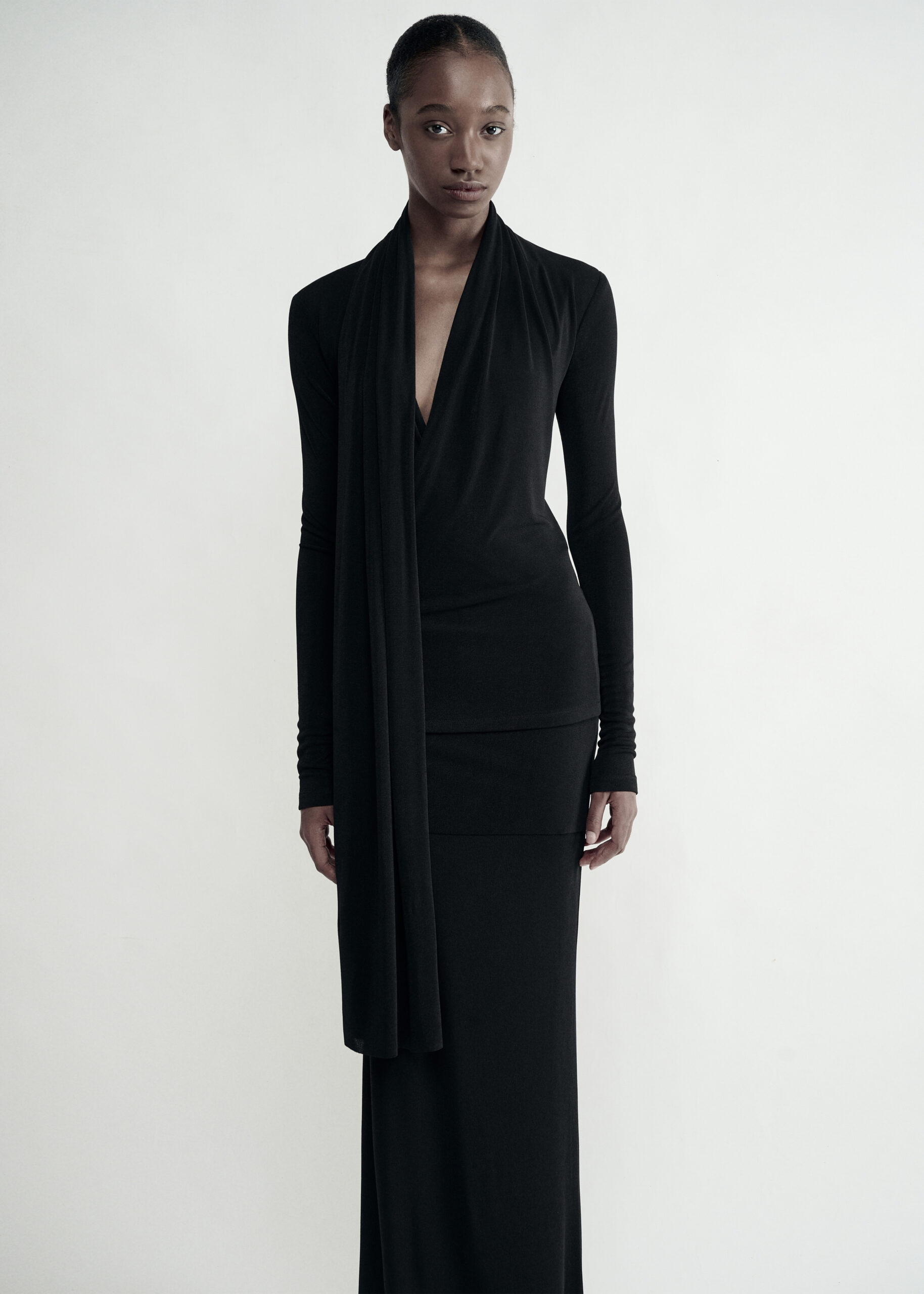 Long-sleeve top with a deep V-neckline, highlighted by an integrated scarf detail that drapes fluidly along the body. Crafted from a lightweight stretch knit, it follows the body’s natural lines while maintaining a balance between structure and fluidity. A refined design, versatile enough for both day and evening wear.