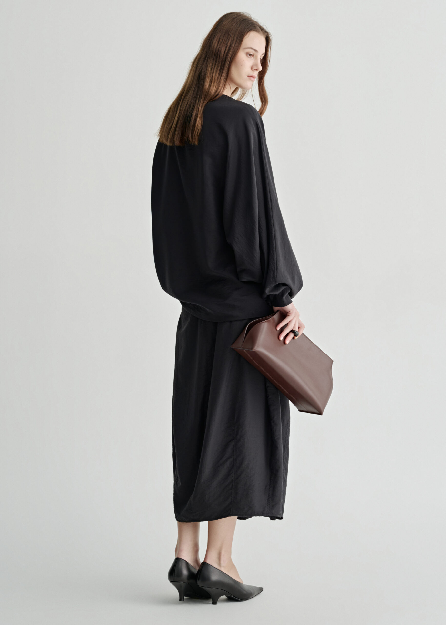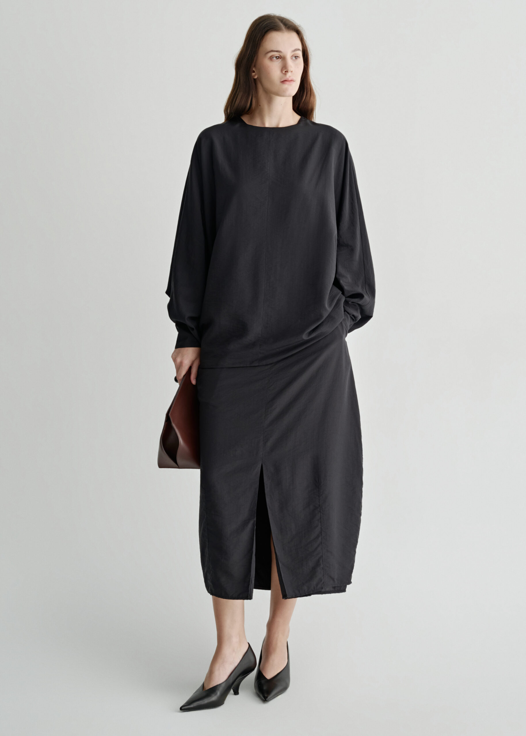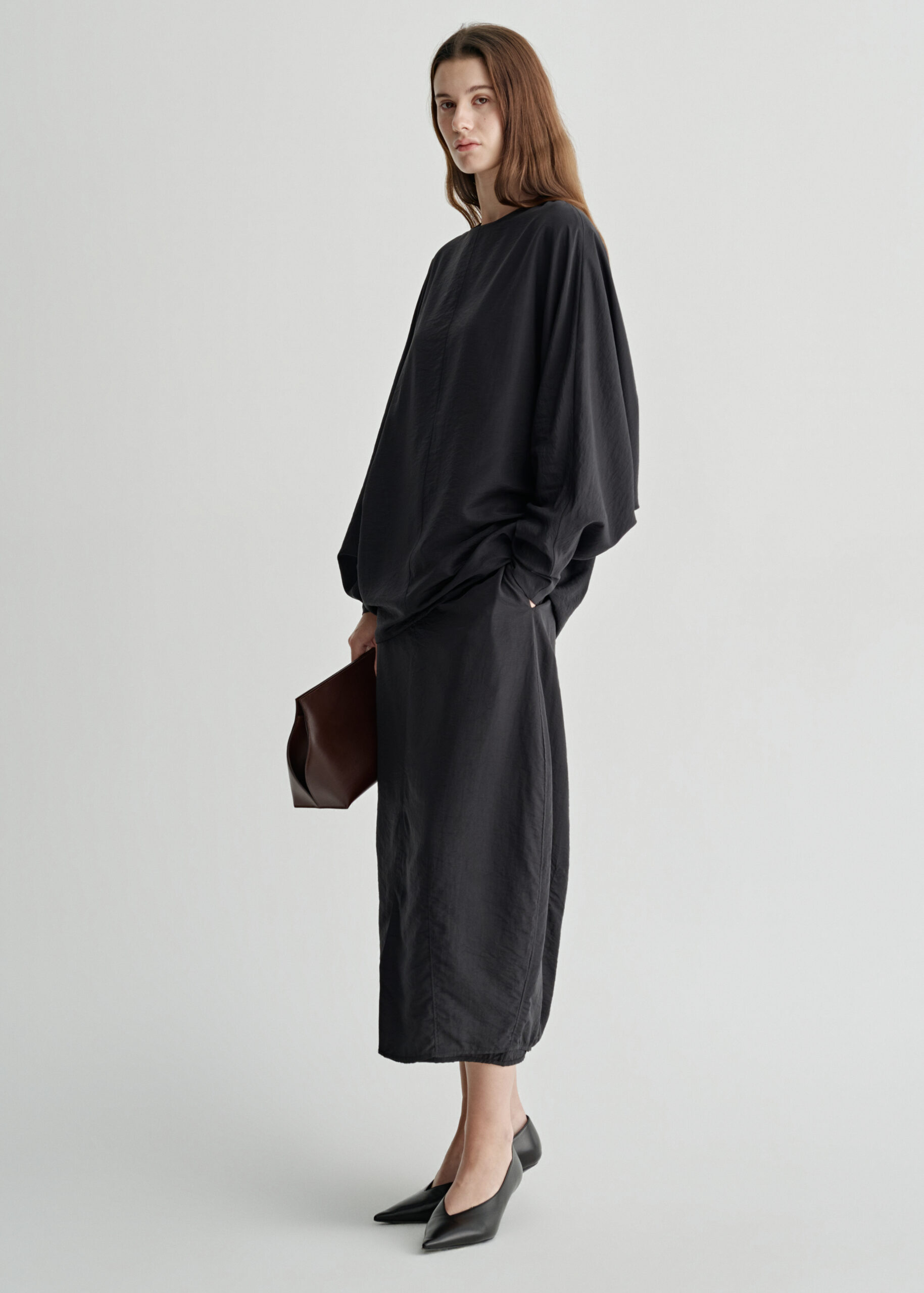 A cocoon-shaped skirt crafted from a lightweight silk blend with a subtle semi-sheer finish.