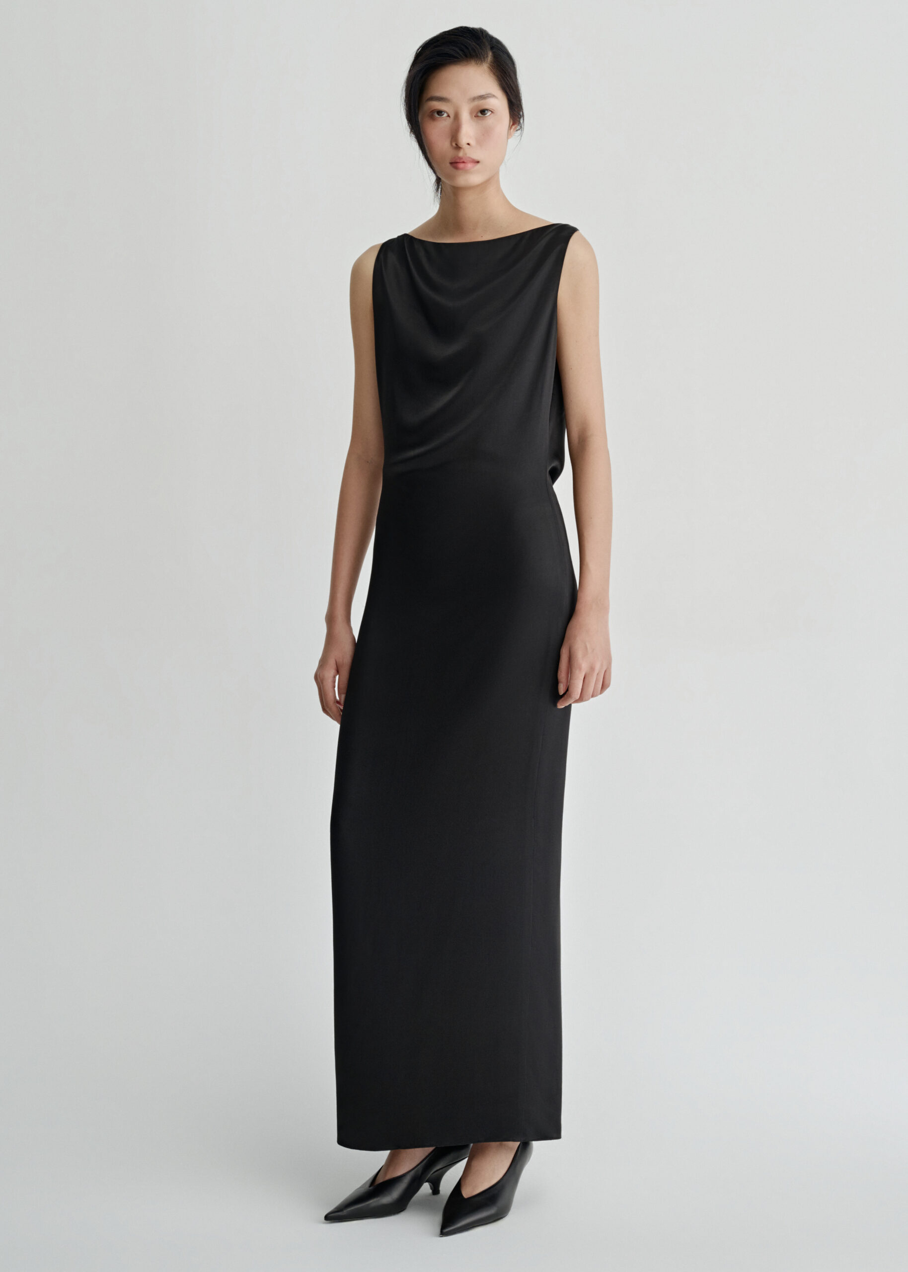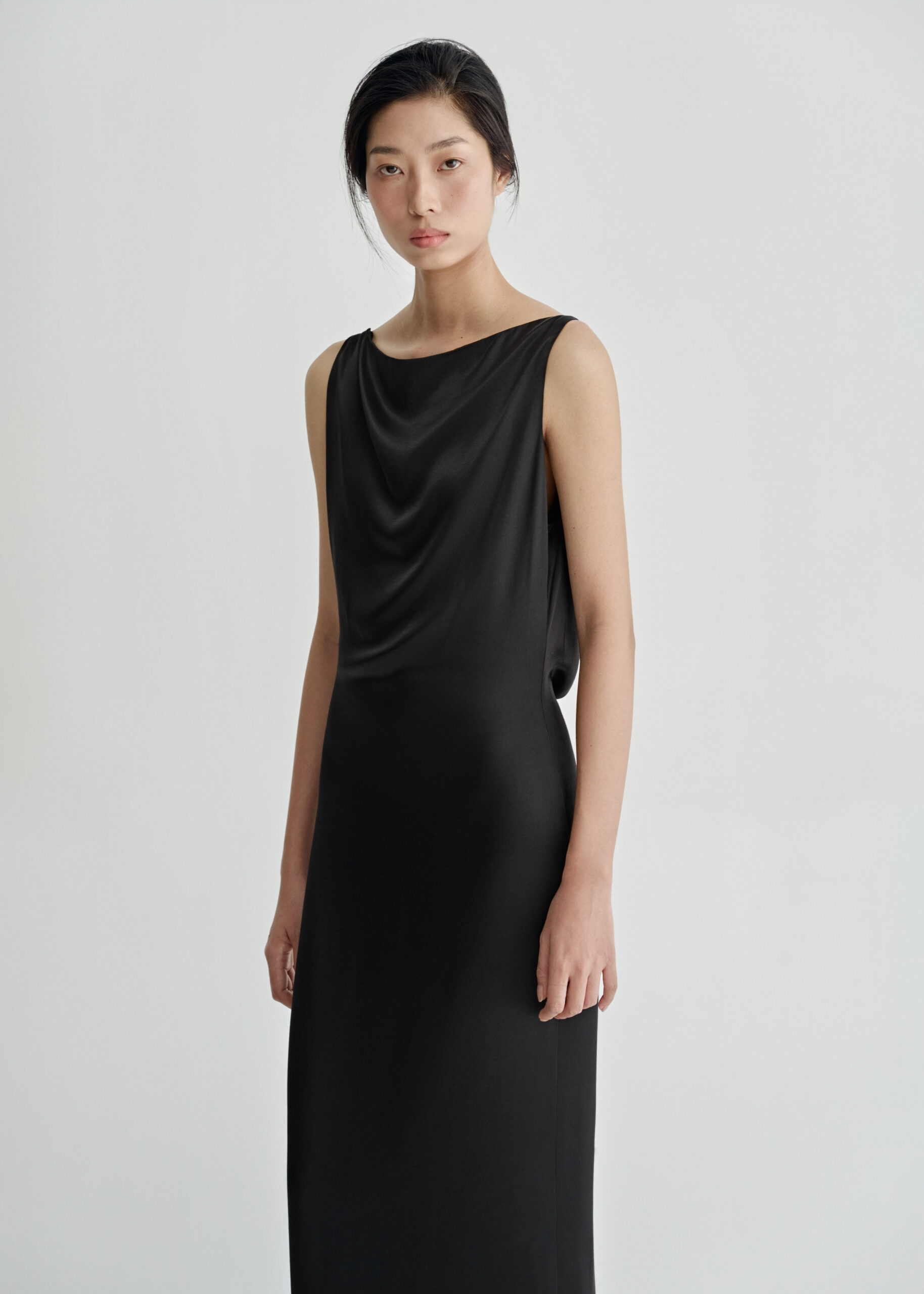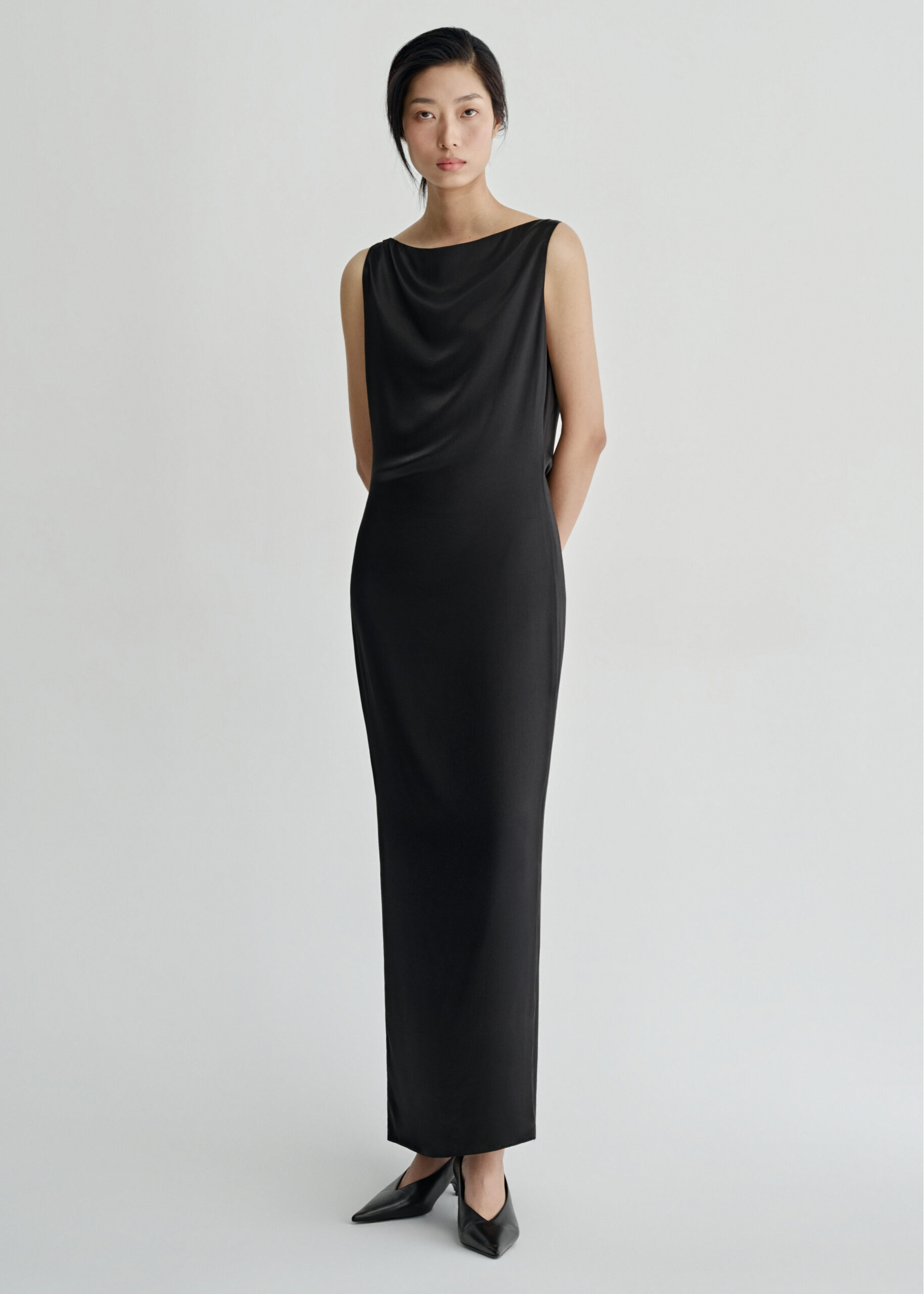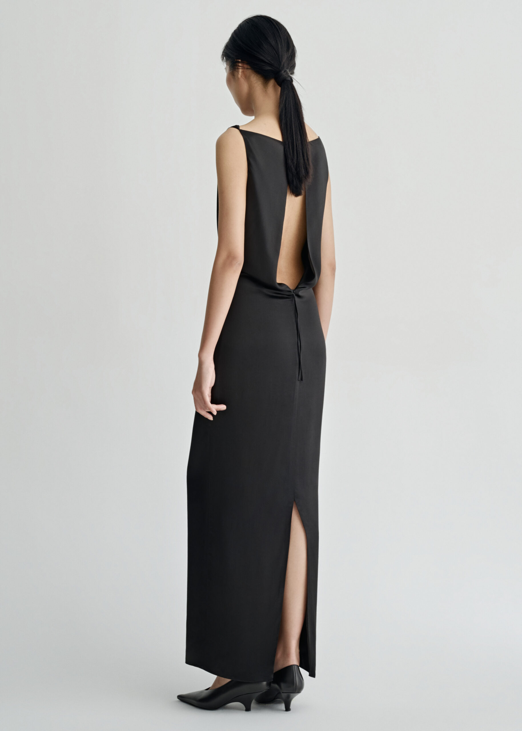 Featuring an open back with a slit, a center back hem vent, and a concealed back zip closure with a hook-and-eye at the neckline.
