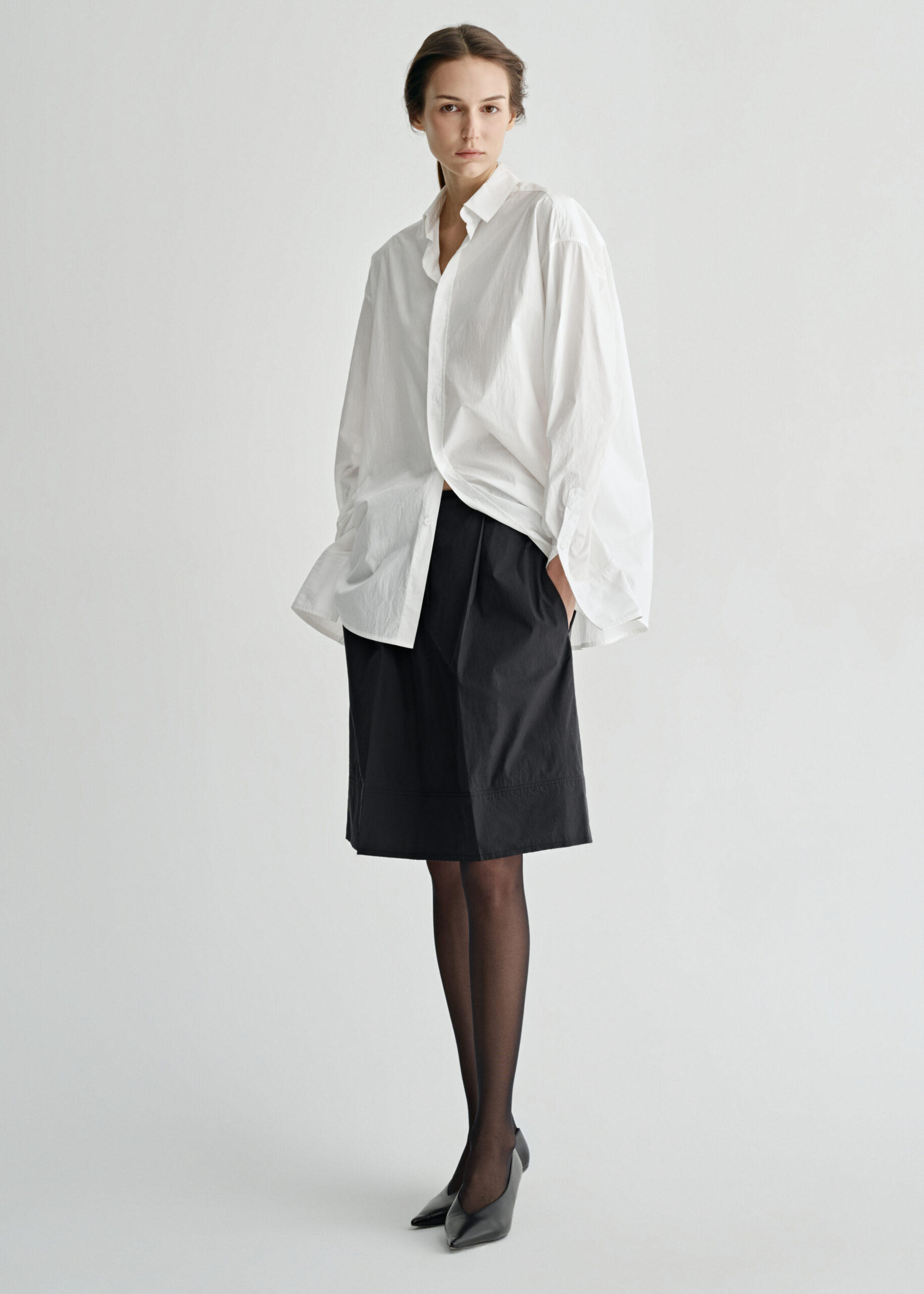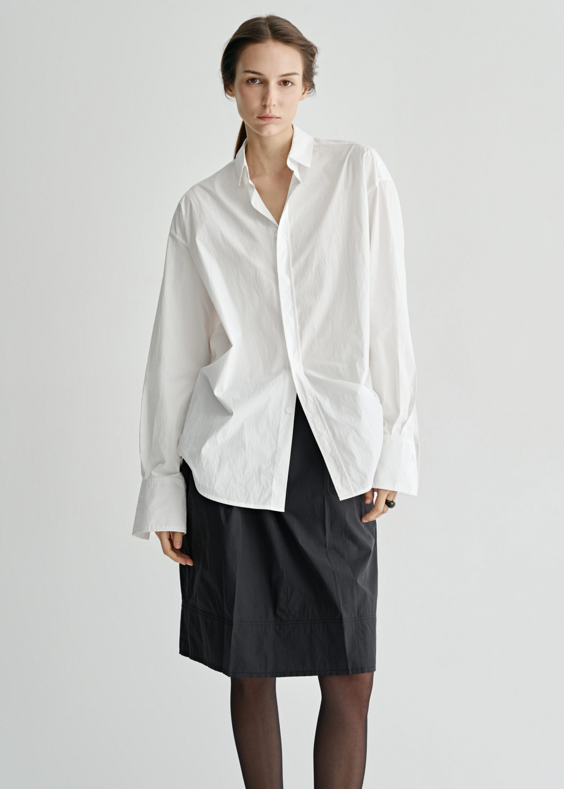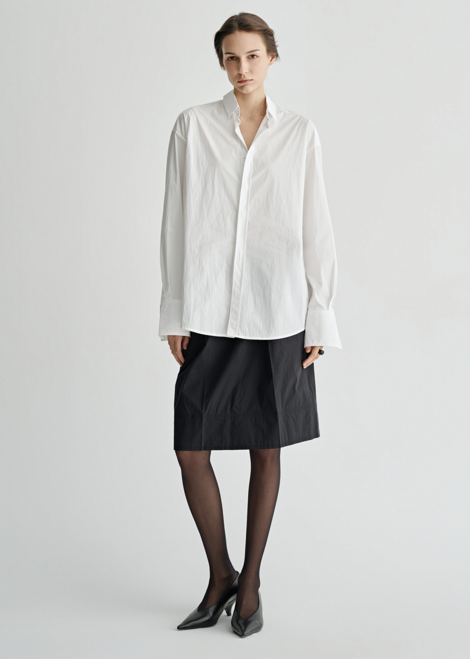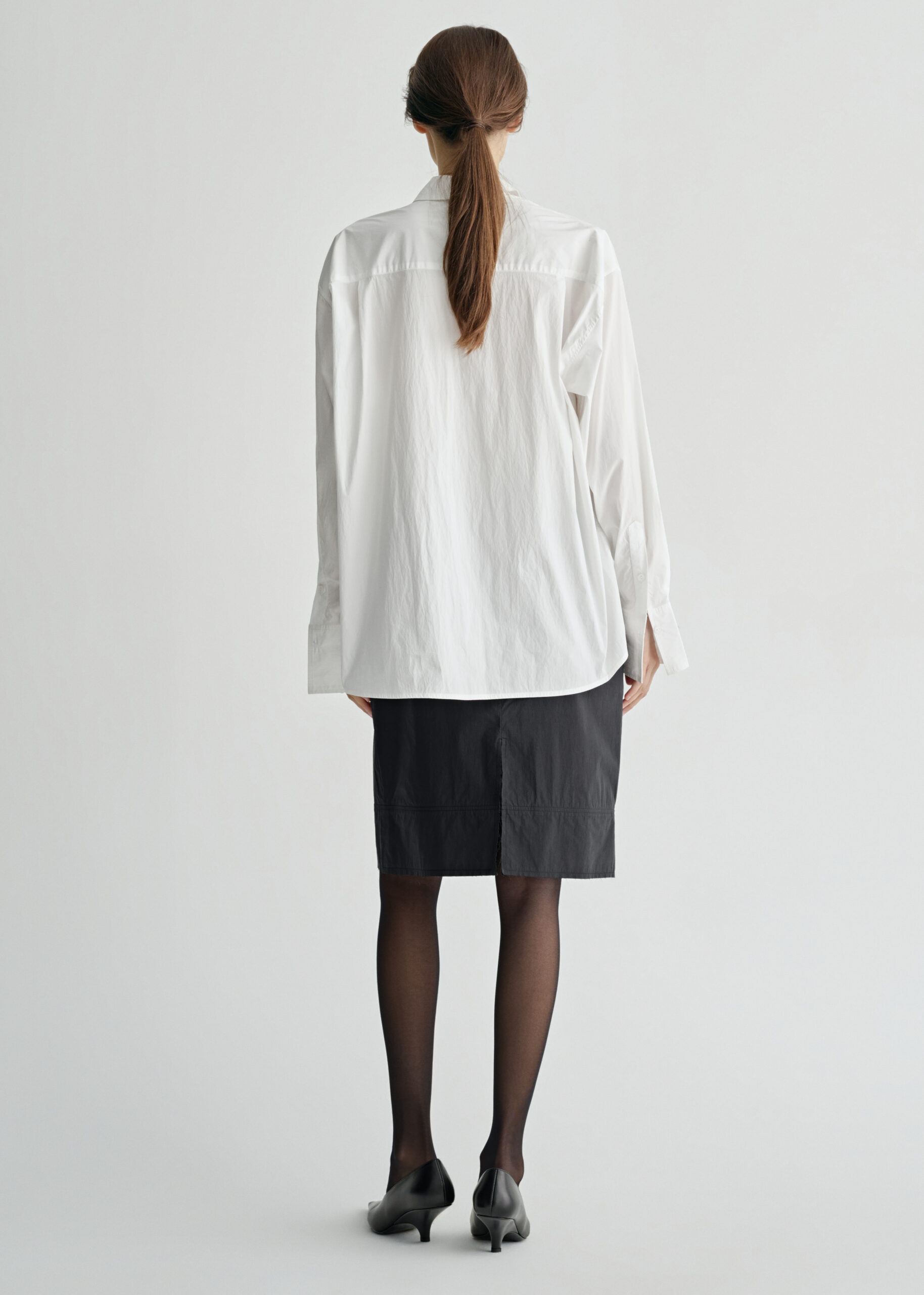 Featuring a slim back yoke and a concealed button placket, the design creates a modern look.