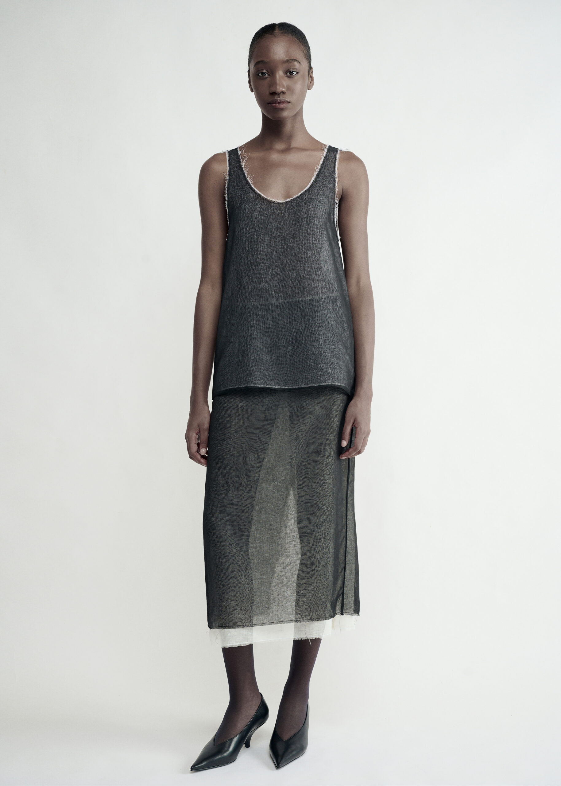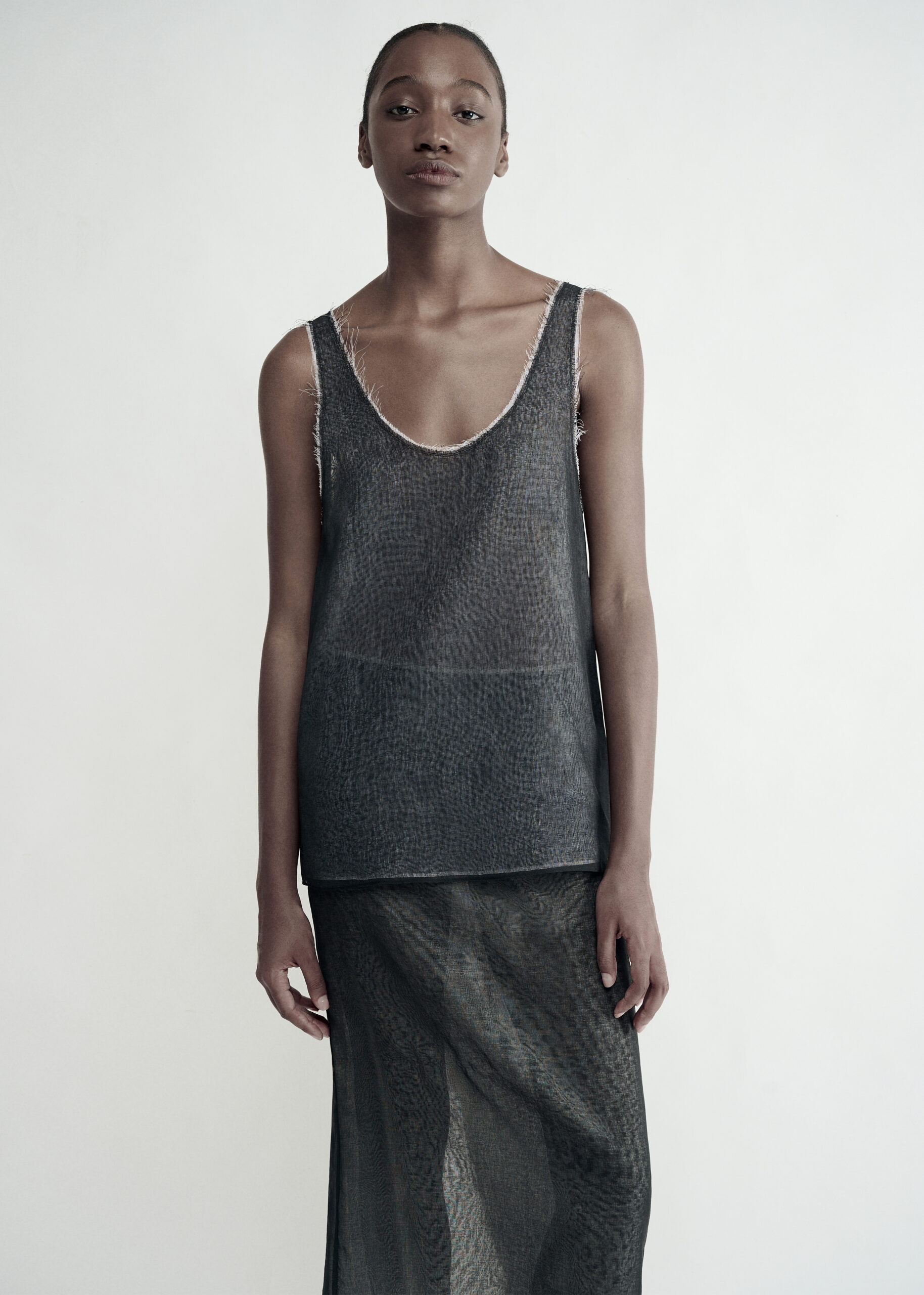 Sheer linen tank top with a deep round neckline and raw-edge details, offering an airy feel and a refined layered effect.