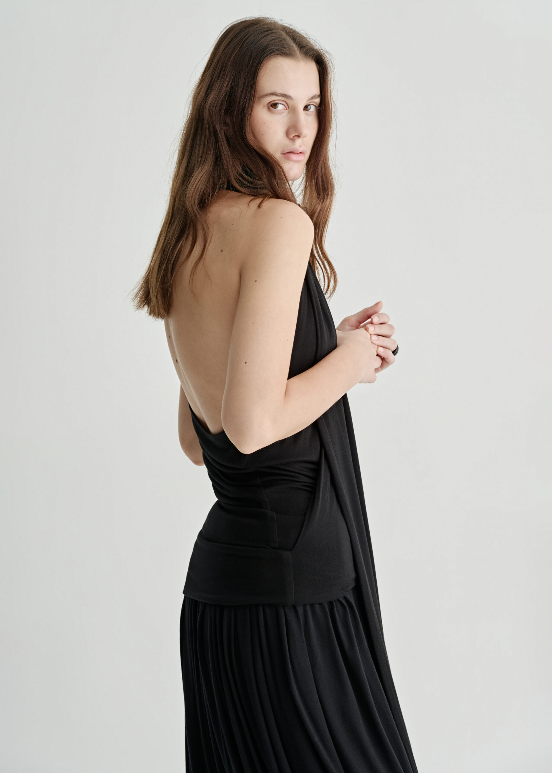 A halter top with a deep V neckline, defined by a scarf-like draped detail that falls softly along the body.