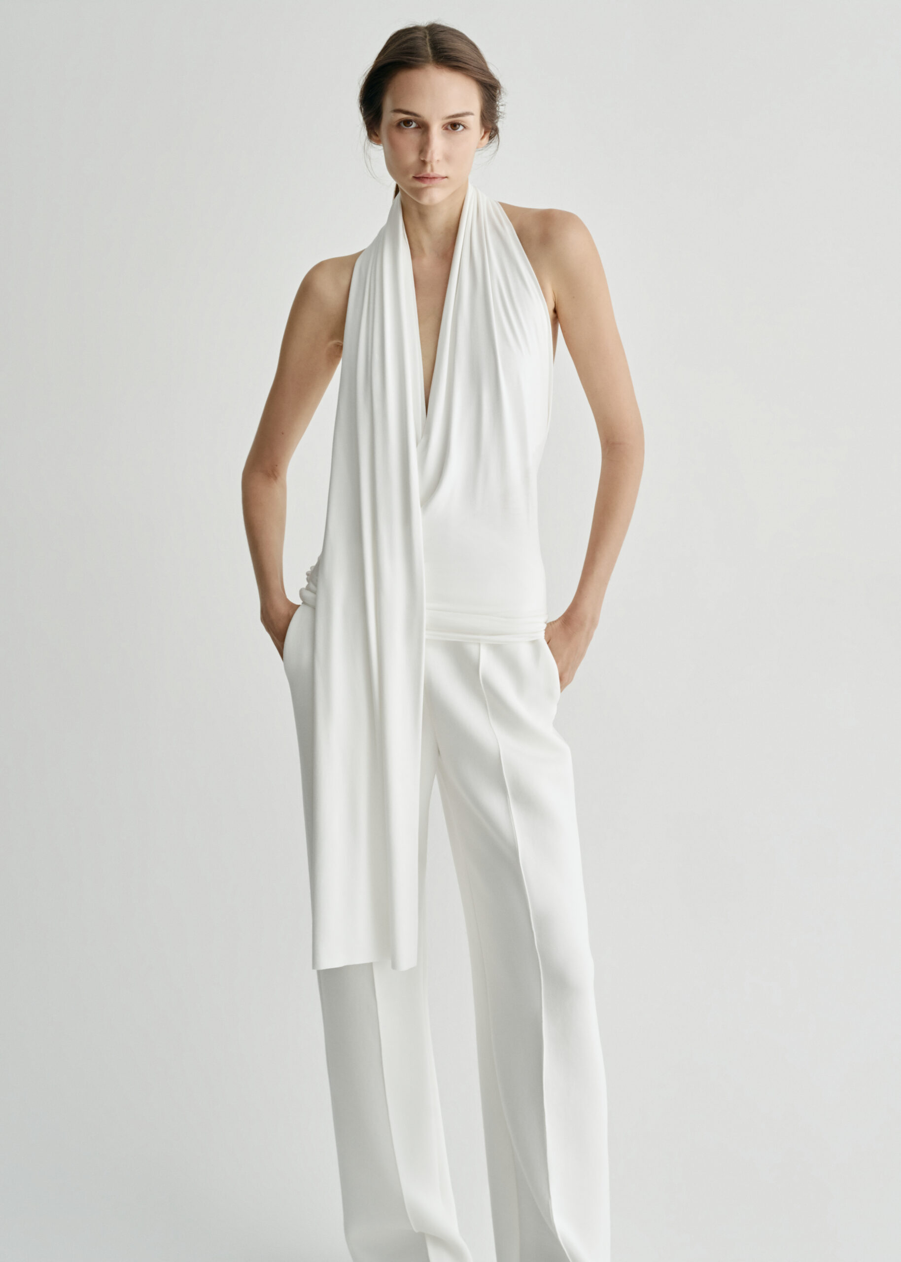 A halter top with a deep V neckline, defined by a scarf-like draped detail that falls softly along the body.