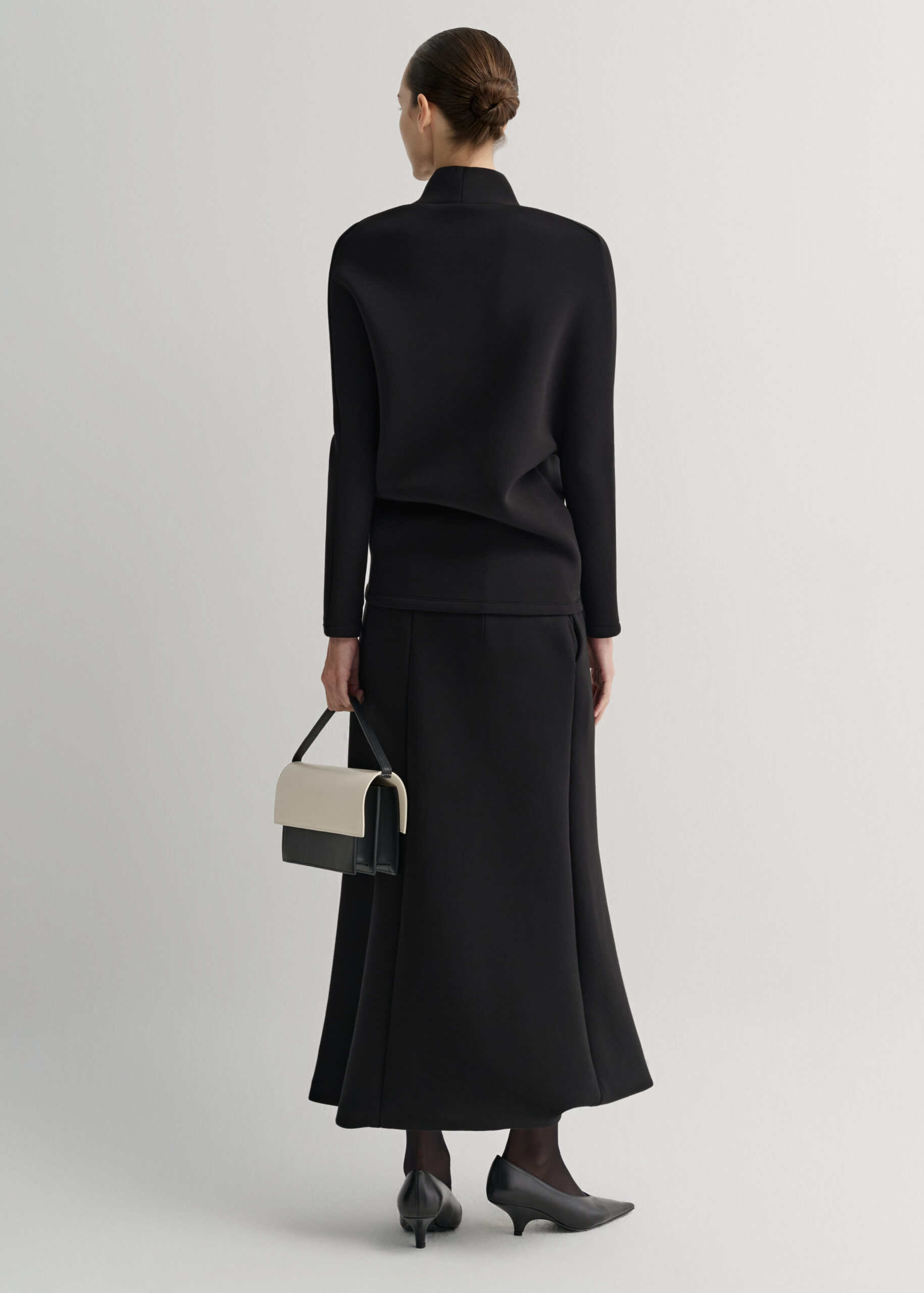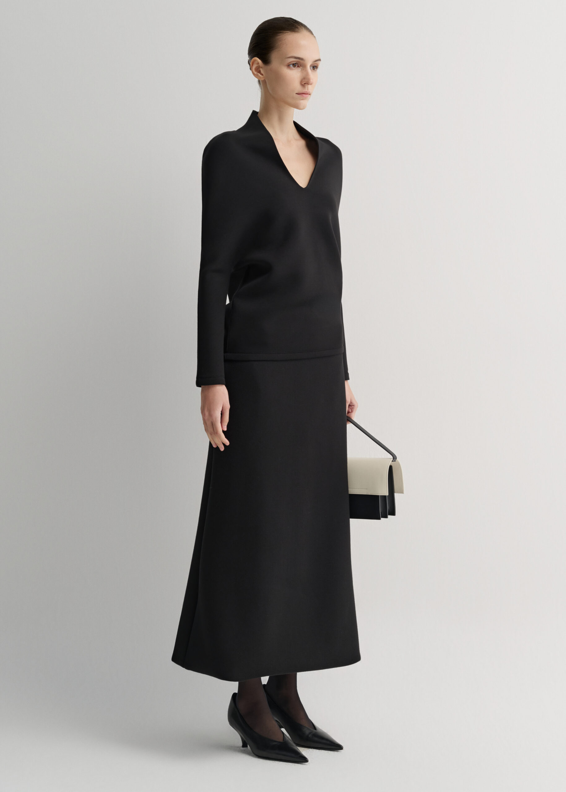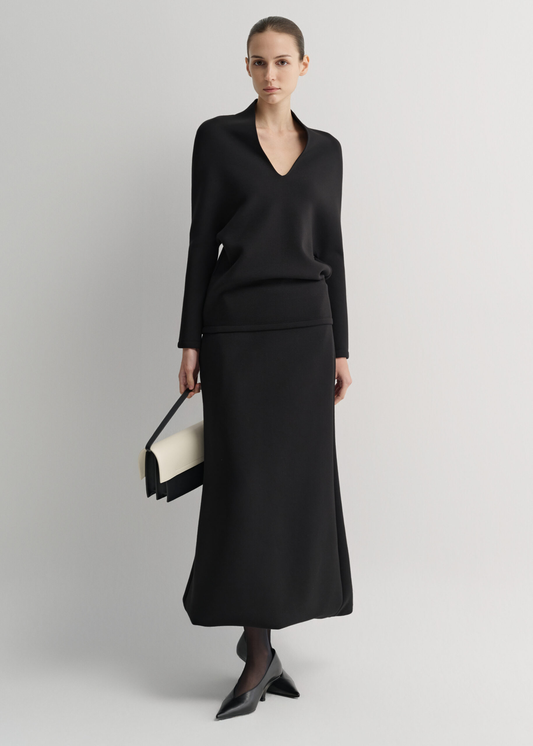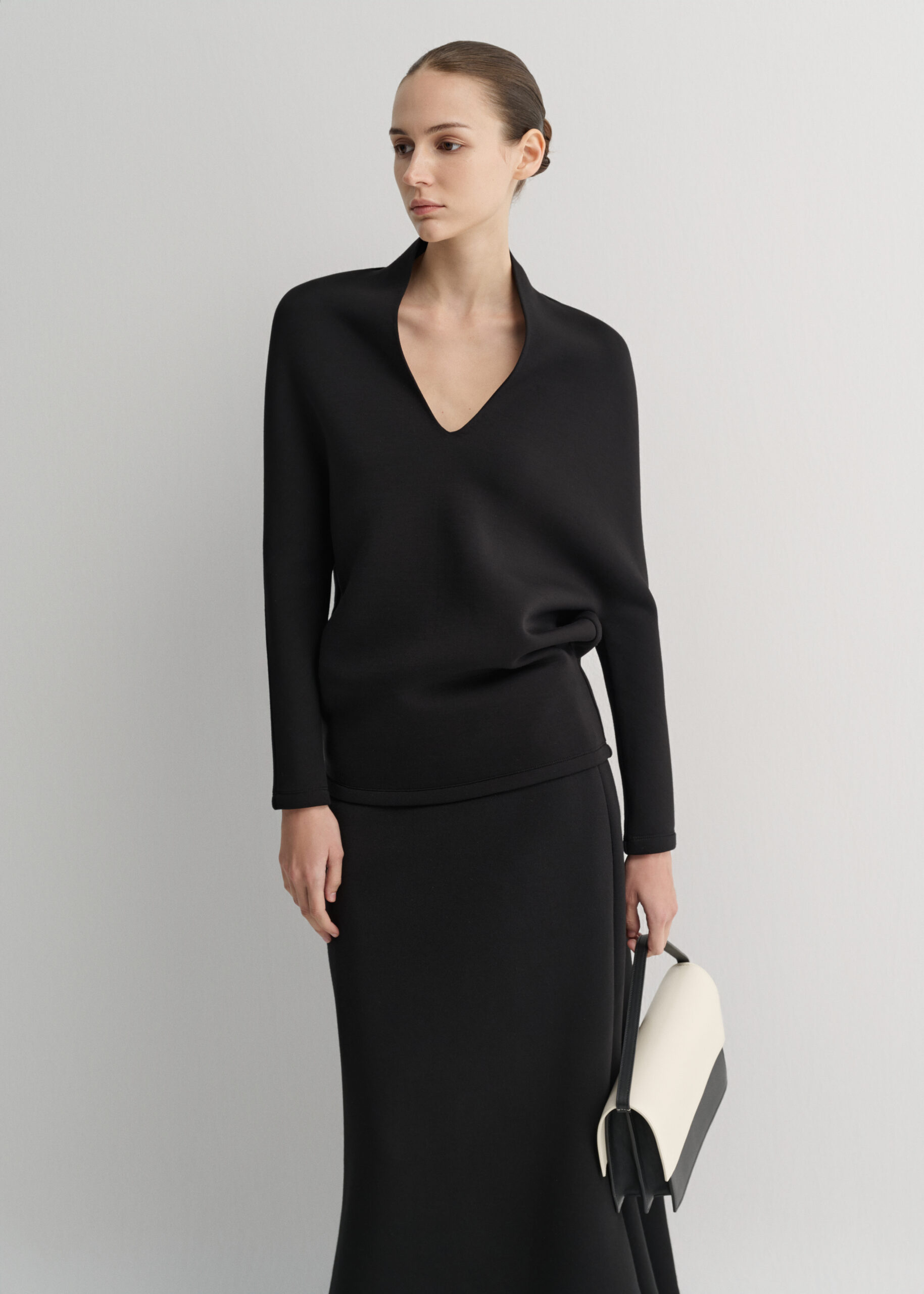 Long-sleeved top crafted from soft foam fabric with a smooth drape. Designed with a deep V-neckline and softly rounded shoulders, offering a refined, modern silhouette with a fluid, elegant flow.